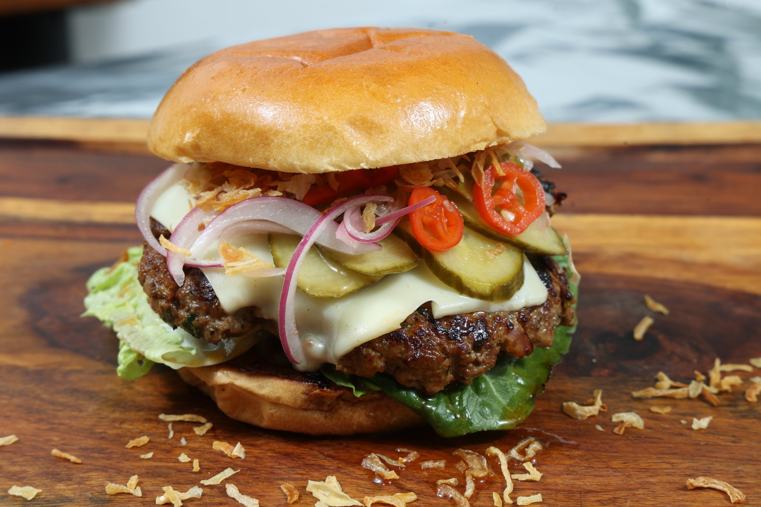Romaine, Pickle Peppers, Dill Pickle, Crispy Onions, Aioli