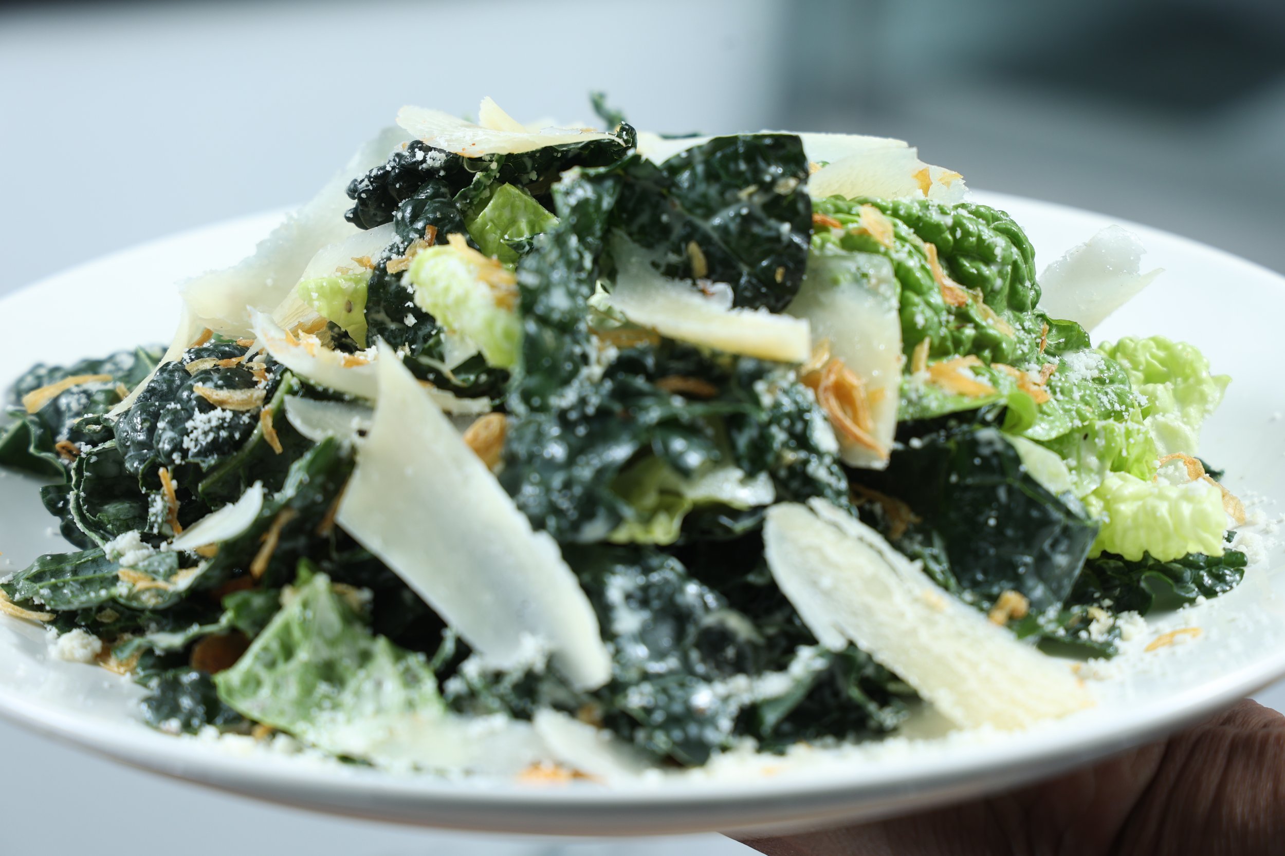 Pulled Chicken, Kale, Romaine, Crispy Onions, Shaved Parmesan Cheese.